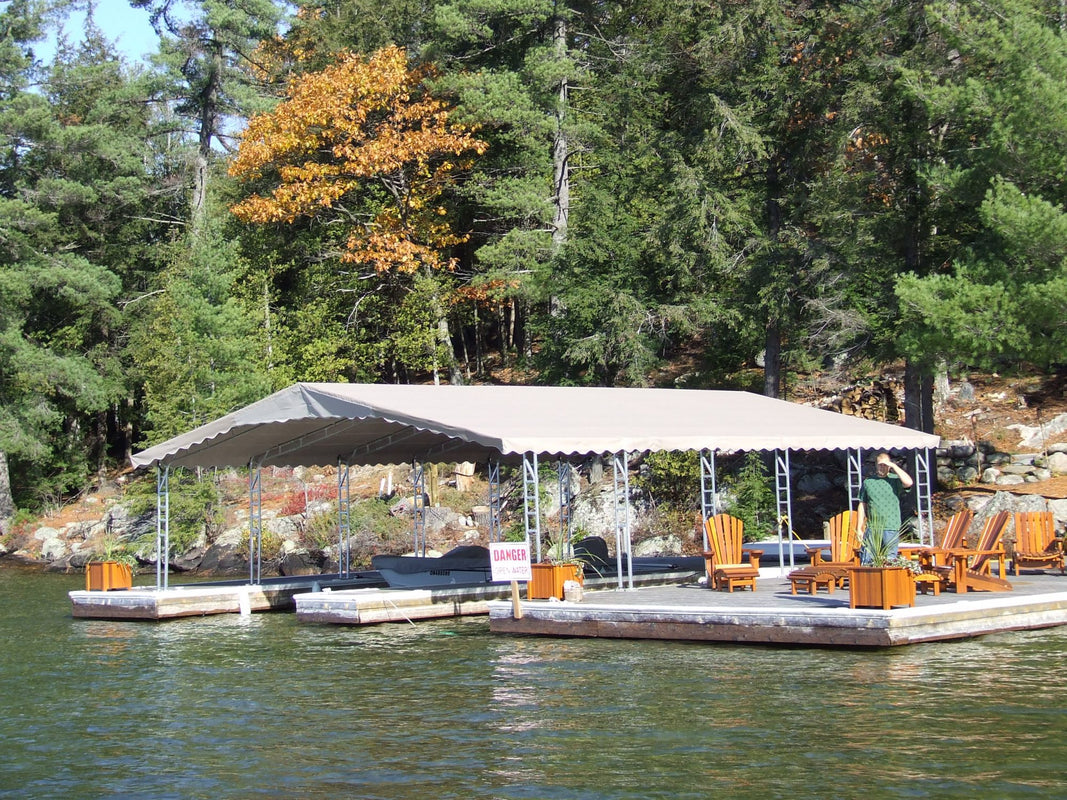 Aquadome manufactures and installs customized classic gabled, cantilevered boat awnings, modern cantilevered boat awnings, dock slip covers, dock and deck shades, winter car storage, winter boat storage and dock ladders.